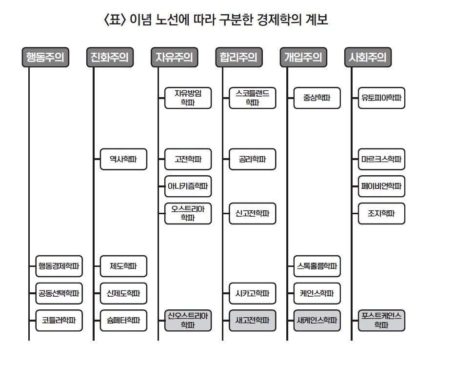 제 책에서는 22개 학파를 소개했으나, 이념 노선을 6개로 하여 비슷한 학파들을 시대순으로 묶었습니다. 이념 노선은 진화주의, 자유주의, 합리주의, 개입주의, 사회주의, 행동주의 등 6개로 나누었는데요, 예를 들어 진화주의 이념에 역사학파, 제도학파, 신제도학파, 슘페터학파를 포함시켰습니다.