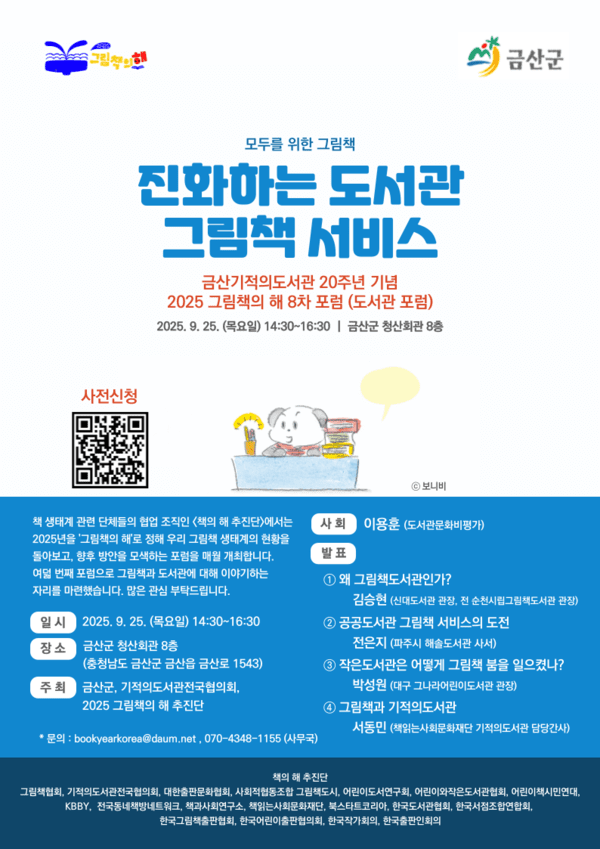 책의 해 추진단은 9월 25일(목) 오후 2시 30분부터 4시 30분까지 금산군 청산회관 8층에서 '2025 그림책의 해 8차 포럼 : 진화하는 도서관 그림책 서비스'를 개최한다.