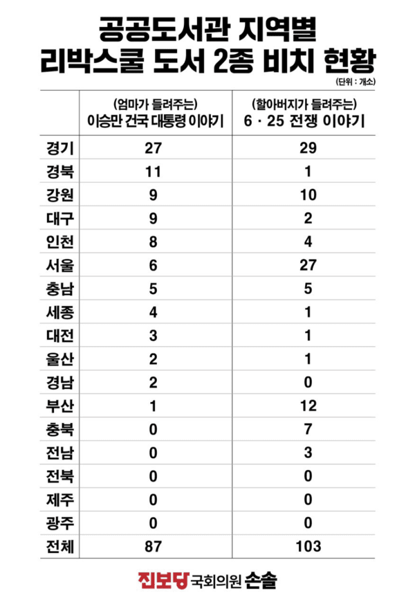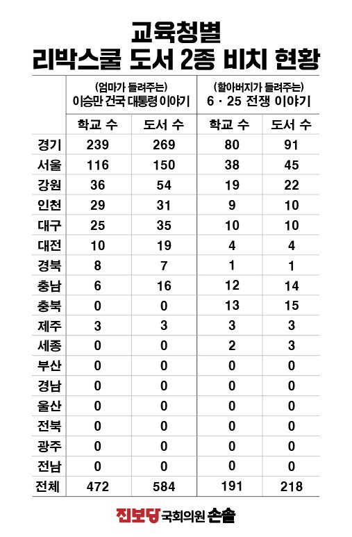 이중 경기도는 '(엄마가 들려주는) 이승만 건국 대통령 이야기'를 239개 학교에서 269권을 '(할아버지가 들려주는) 6·25전쟁 이야기'를 80개 학교에서 91권을 비치하고 있으며, 서울은 '엄마가 들려주는) 이승만 건국 대통령 이야기'를 116개 학교에서 150권을 '(할아버지가 들려주는) 6·25전쟁 이야기'를 38개 학교에서 45권을 비치하고 있다.