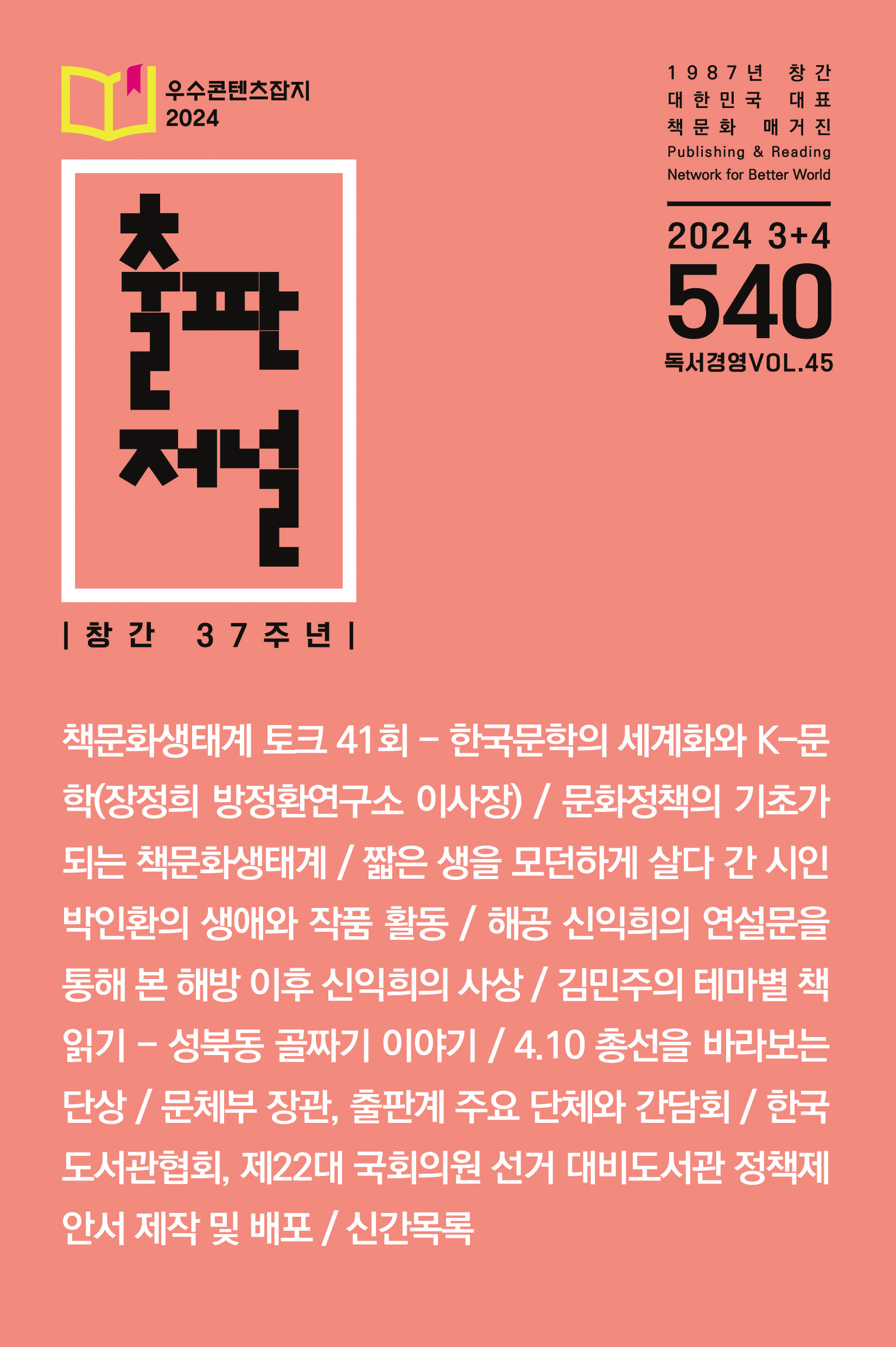책문화네트워크가 <출판저널> 통권 540호(2024년 3+4월호)를 발행했다. <출판저널>은 1987년 7월 20일에 창간된 출판전문지로서 2024년 창간 37주년을 맞는다.